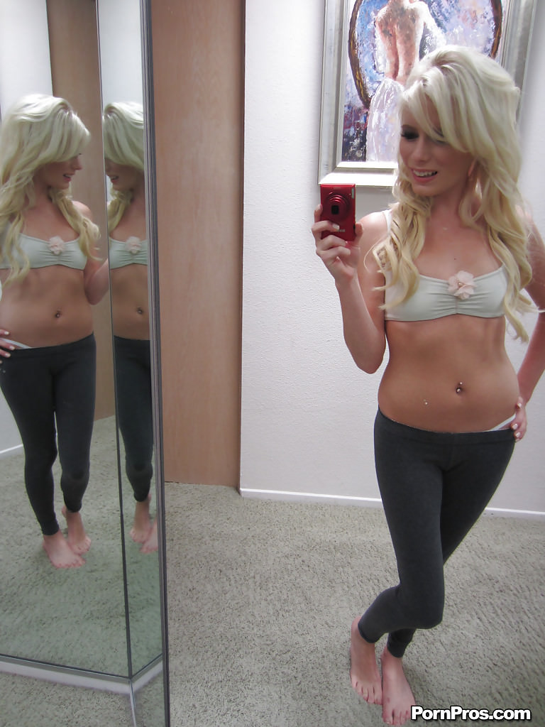 Стройная блондинистая красотка с приятным личиком и милой улыбкой позирует перед зеркалом на шкафу в белом топике и серых лосинах. Одежда быстро исчезает с ее тела, и развратная шлюшка остается, в чем мать родила. Прекрасная и сексапильная давалка фоткает себя на розовый фотик, интригующе улыбаясь и как бы приглашая вступить с ней в связь.