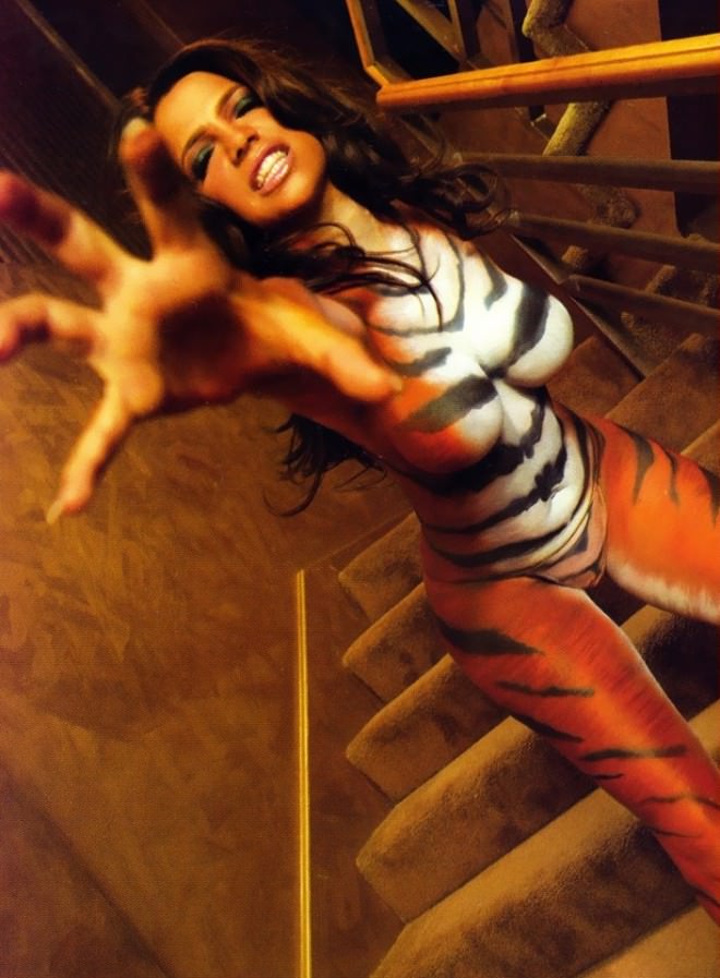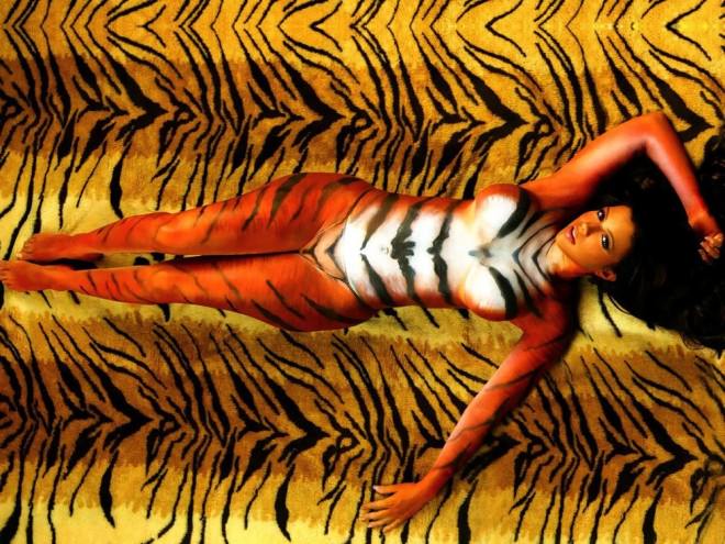 Обожаю девушек, которых разрисовывают красками на голое тело, рисуют им различные костюмы, окраску животных и другую ерунду, такое искусство на живых голых девушках называют бодиарт. В этой подборке нанесли бодиарт на кожу одной красивой брюнетки с большими сиськами, конечно это не порно, а просто эротика, так как нам хорошо виден силуэт обнаженной девушки, и при этом все скрыто от глаз краской. Бодиарт этой девушки выполнен в стиле тигрицы, красотка позирует в различных позах, словно молодая тигрица привлекает самцов к спариванию )